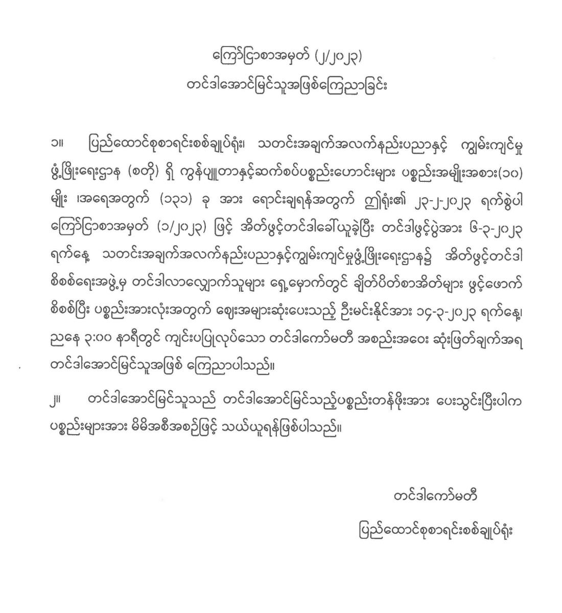 ကွန်ပျူတာနှင့်ဆက်စပ်ပစ္စည်းဟောင်းများ ရောင်းချရန်အတွက် တင်ဒါအောင်မြင်သူအဖြစ်ကြေညာခြင်း