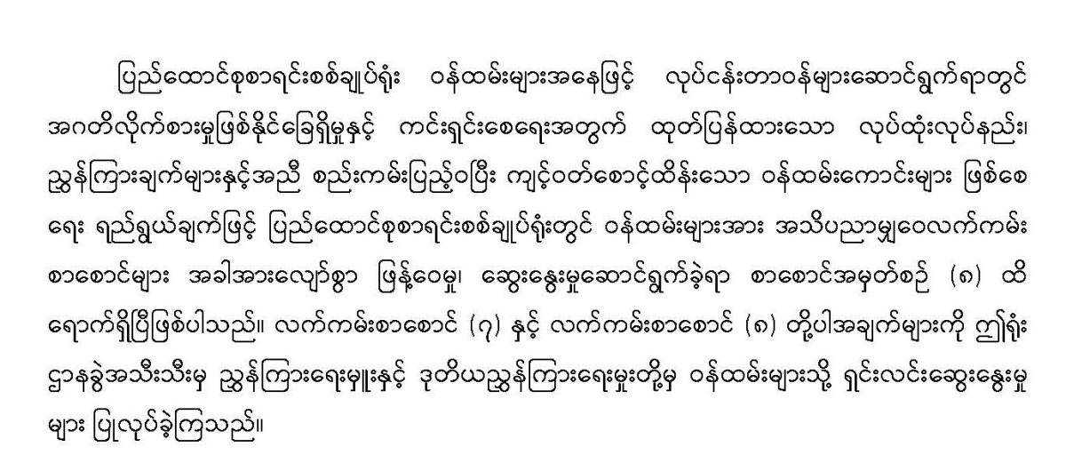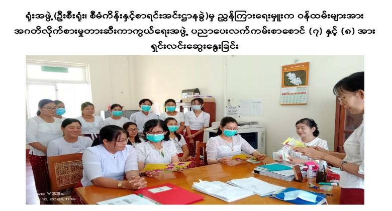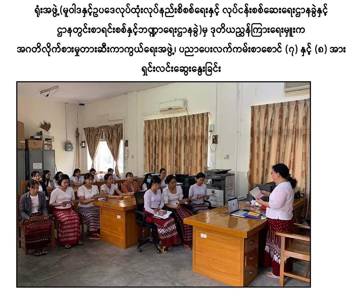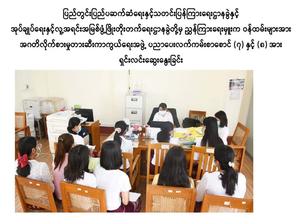 ပြည်ထောင်စုစာရင်းစစ်ချုပ်ရုံး၊ ဌာနခွဲအသီးသီးမှ ညွှန်ကြားရေးမှူးနှင့် ဒုတိယညွှန်ကြားရေးမှူးတို့မှ ဝန်ထမ်းများသို့ အဂတိလိုက်စားမှုတားဆီးကာကွယ်ရေးအဖွဲ့ ပညာပေးလက်ကမ်းစာစောင် (၇) နှင့် (၈) အား ရှင်းလင်းဆွေးနွေးခြင်း
