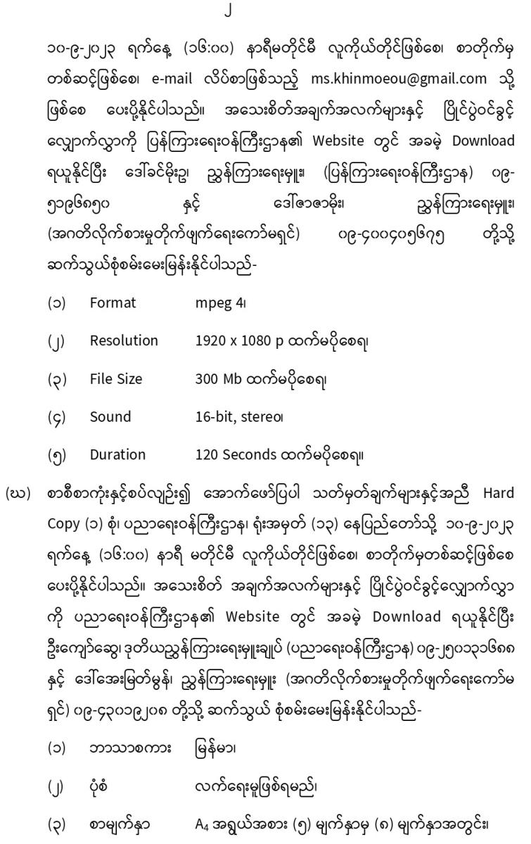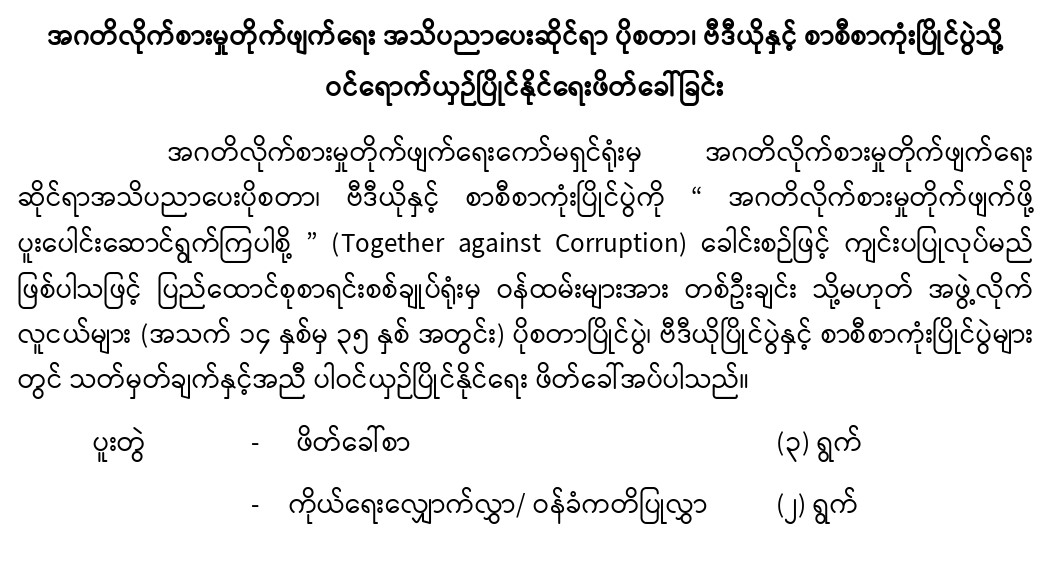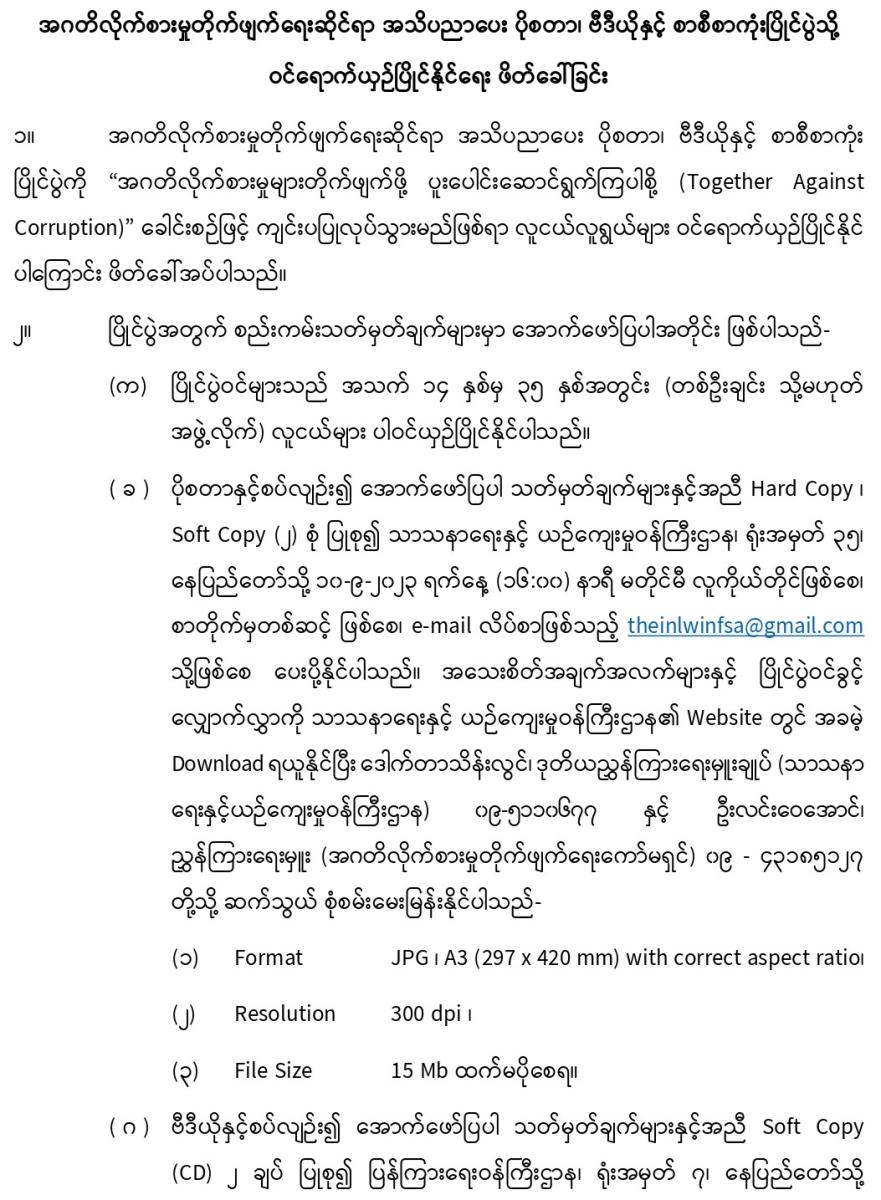 အဂတိလိုက်စားမှုတိုက်ဖျက်ရေး အသိပညာပေးဆိုင်ရာ ပိုစတာ၊ ဗီဒီယိုနှင့် စာစီစာကုံးပြိုင်ပွဲသို့ ဝင်ရောက်ယှဉ်ပြိုင်နိုင်ရေးဖိတ်ခေါ်ခြင်း