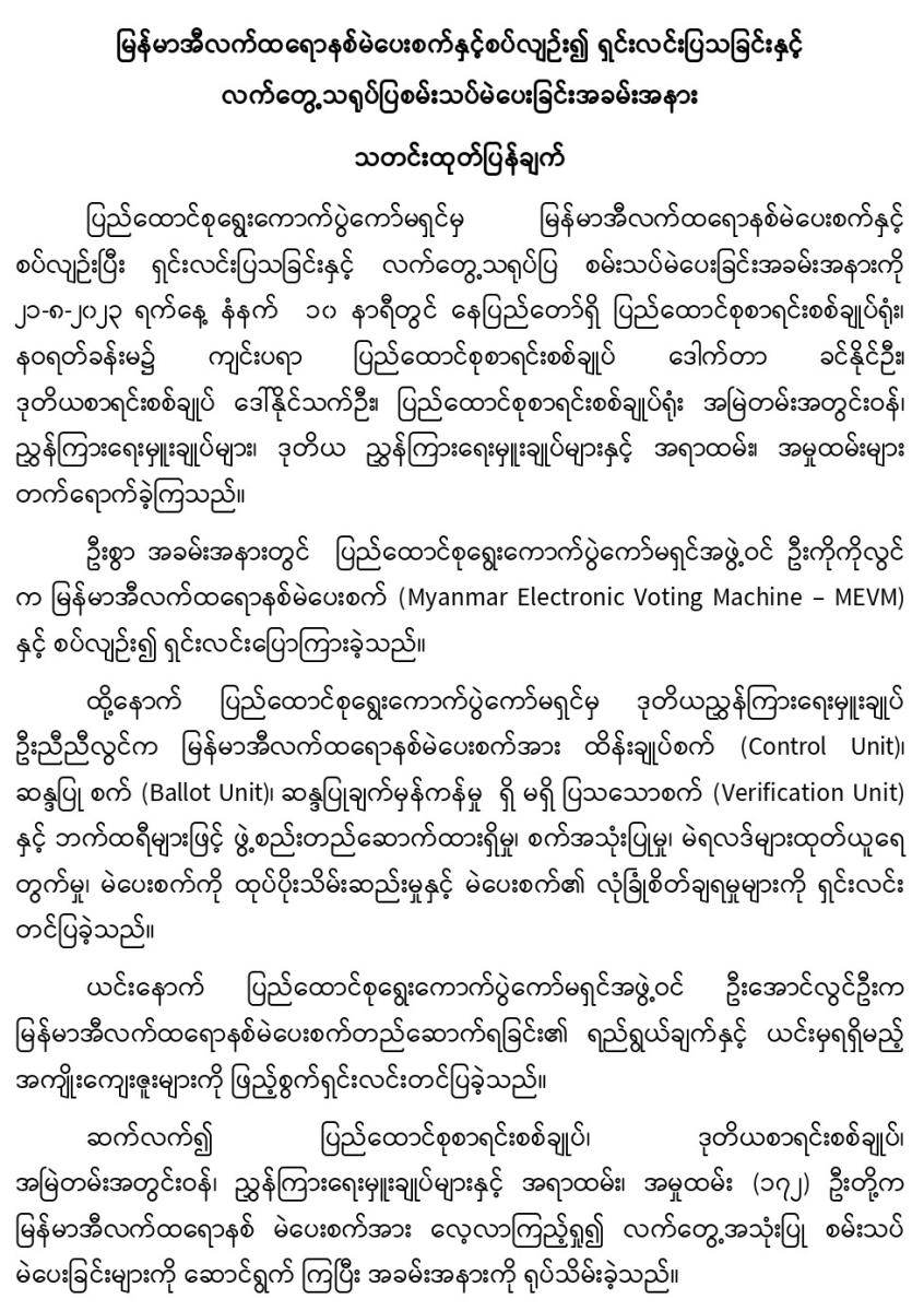 ၂၁-၈-၂၀၂၃ ရက်နေ့တွင် မြန်မာအီလက်ထရောနစ်မဲပေးစက်နှင့်စပ်လျဉ်း၍ ရှင်းလင်းပြသခြင်းနှင့် လက်တွေ့သရုပ်ပြစမ်းသပ်မဲပေးခြင်းအခမ်းအနား