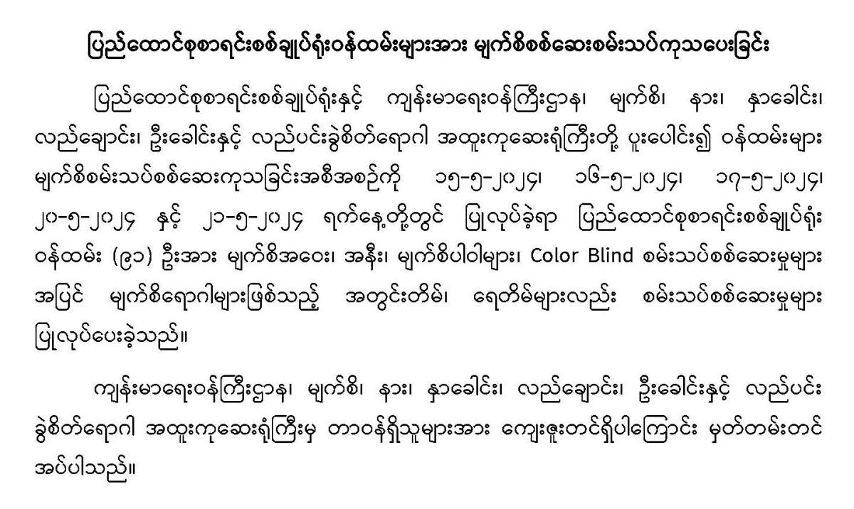 ၁၅-၅-၂၀၂၄၊ ၁၆-၅-၂၀၂၄၊ ၁၇-၅-၂၀၂၄၊ ၂၀-၅-၂၀၂၄ နှင့် ၂၁-၅-၂၀၂၄ ရက်နေ့တို့တွင် ပြည်ထောင်စုစာရင်းစစ်ချုပ်ရုံးဝန်ထမ်းများအား မျက်စိစစ်ဆေးစမ်းသပ်ကုသပေးခြင်း