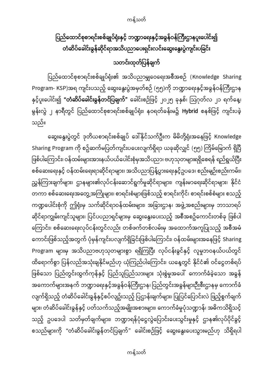 ပြည်ထောင်စုစာရင်းစစ်ချုပ်ရုံးနှင့် ဘဏ္ဍာရေးနှင့်အခွန်ဝန်ကြီးဌာနပူးပေါင်း၍ တံဆိပ်ခေါင်းခွန်ဆိုင်ရာအသိပညာပေးရှင်းလင်းဆွေးနွေးပွဲကျင်းပခြင်း