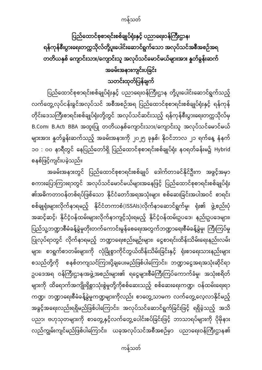 ပြည်ထောင်စုစာရင်းစစ်ချုပ်ရုံးနှင့် ပညာရေးဝန်ကြီးဌာန၊ ရန်ကုန်စီးပွားရေးတက္ကသိုလ်တို့ပူးပေါင်း‌ဆောင်ရွက်သော အလုပ်သင်အစီအစဉ်အရ တတိယနှစ် ကျောင်းသား/ကျောင်းသူ အလုပ်သင်မောင်မယ်များအား နှုတ်ခွန်းဆက် အခမ်းအနားကျင်းပခြင်း