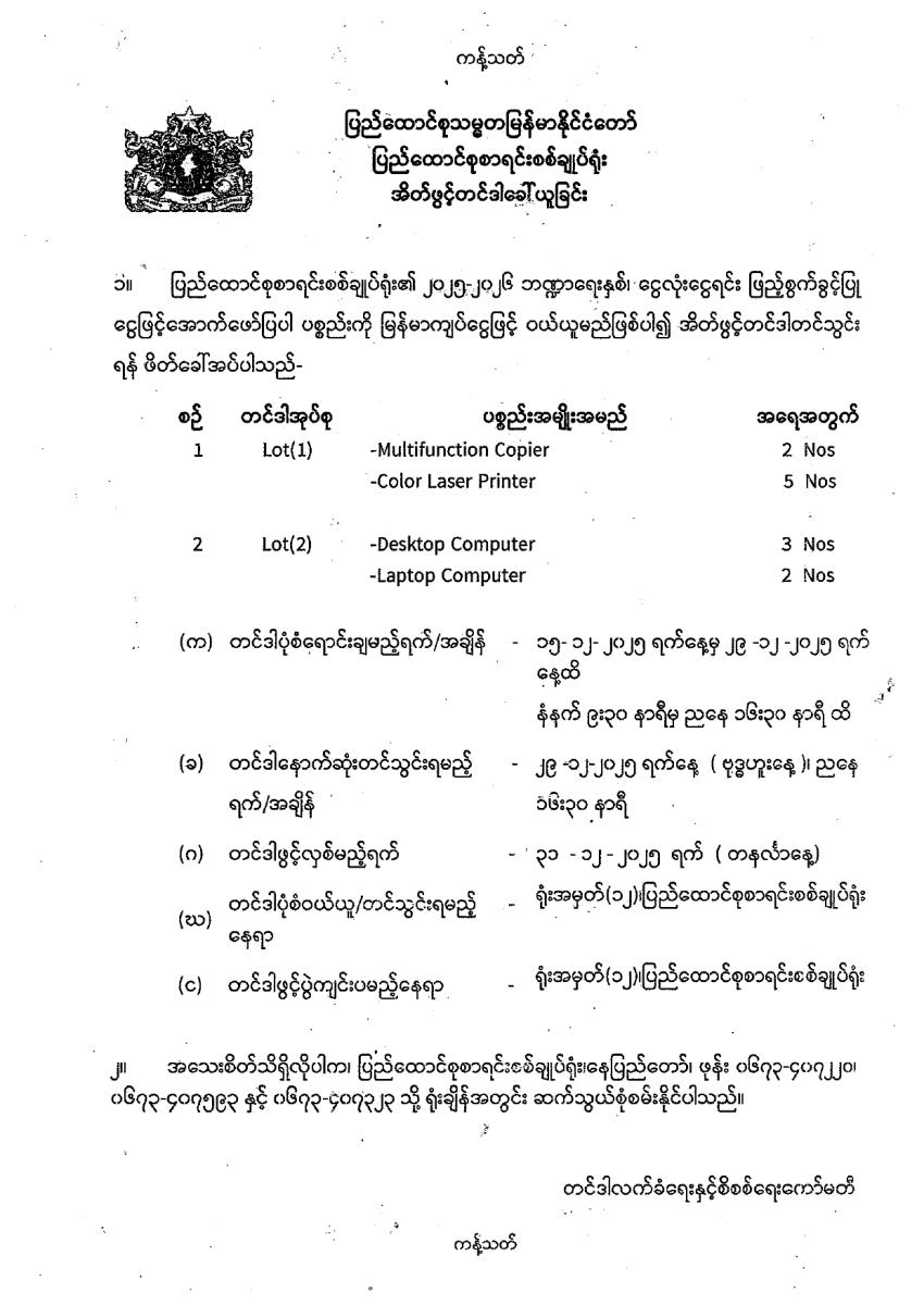 ပြည်ထောင်စုစာရင်းစစ်ချုပ်ရုံး ၊ Multifunction Copier, Color Laser Printer, Desktop Computer and Laptop Computer အိတ်ဖွင့်တင်ဒါခေါ်ယူခြင်း