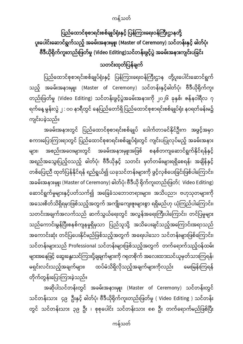 ပြည်ထောင်စုစာရင်းစစ်ချုပ်ရုံးနှင့် ပြန်ကြားရေးဝန်ကြီးဌာနတို့ပူးပေါင်းဆောင်ရွက်သည့် အခမ်းအနားမှူး (Master of Ceremony) သင်တန်းနှင့် ဓါတ်ပုံ၊ ဗီဒီယိုရိုက်ကူးတည်းဖြတ်မှု (Video Editing)သင်တန်းဖွင့်ပွဲ အခမ်းအနားကျင်းပခြင်း