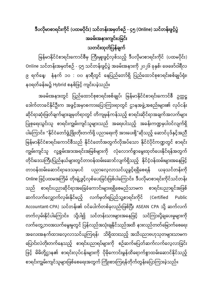 ဒီပလိုမာစာရင်းကိုင် (ပထမပိုင်း) သင်တန်းအမှတ်စဉ် - ၄၅ (Online) သင်တန်းဖွင့်ပွဲ အခမ်းအနားကျင်းပခြင်း